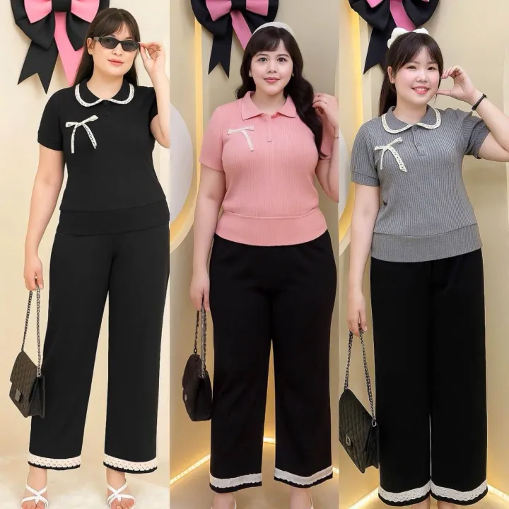 Đồ bộ Nữ BigSiZe 50-95kg —Sét bộ cổ trụ viền ren đính nơ quần suông áo tay nhí phối màu chất thun Gân co giãn mát mẽ