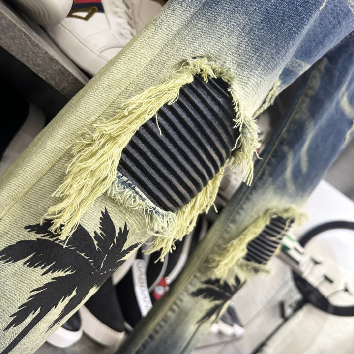 Quần Cầy Dừa Amiri Quần jean bò Nam slimfit wash xanh vàng in hình cây dừa phối rách tua gối vá da nhăn đen Shiny Sunday MQU 033